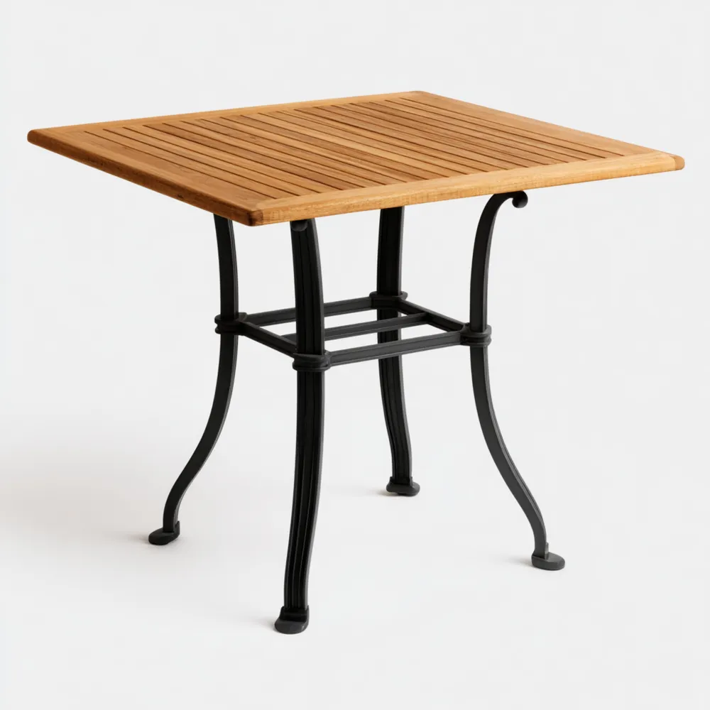 ProduktbeschreibungDieser elegante Gartentisch kombiniert eine 70x70 cm große Holzplatte mit einem robusten Metallgestell. Ideal für den Außenbereich.